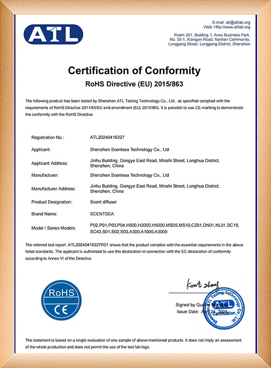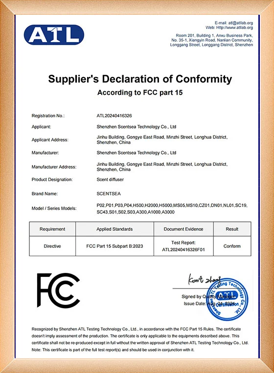 Alla SCENTSEAs doftspridare har CE-, ROHS-, FCC- och SGS-certifieringar. Fram till nu har doftmaskinerna från SCENTSEA installerats i över 70+ länder och hyllats mycket av våra kunder.